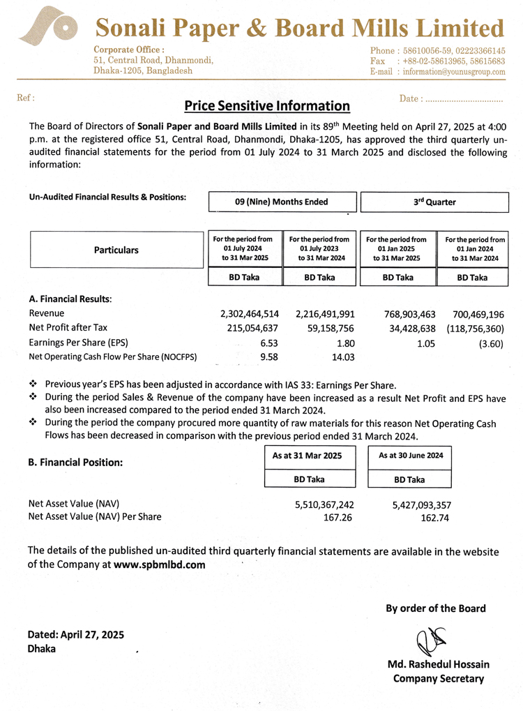 Price Sensitive Information of Sonali Paper & Board Mills Ltd