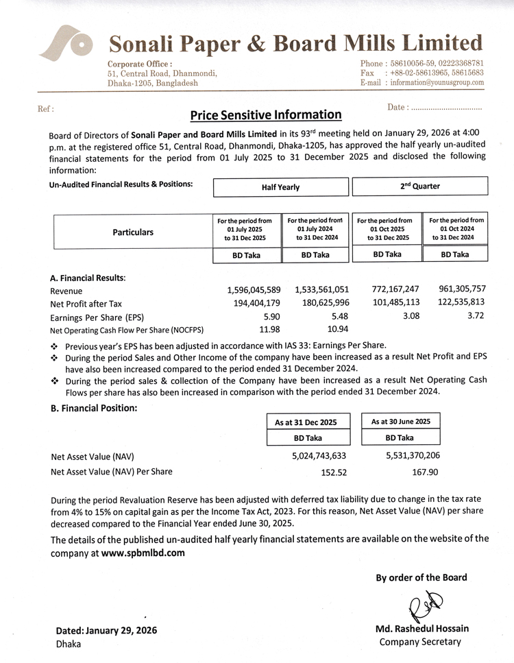 Price Sensitive Information of Sonali Paper & Board Mills Ltd