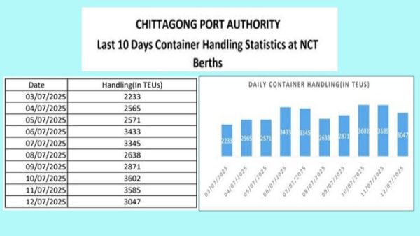 বাণিজ্য ডেস্ক: চট্টগ্রাম ড্রাইডক লিমিটেডের পরিচালনার প্রথম সাত দিনে (০৭-১৩ জুলাই) কন্টেইনার হ্যান্ডলিং কার্যক্রমে উল্লেখযোগ্য অগ্রগতি দেখা গেছে। যা বিগত সময়ের থেকে বড় সাফল্য হিসেবে দেখা হচ্ছে। প্রতিদিন গড়ে ২২৫