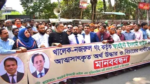 নিজস্ব প্রতিবেদক: দেশের জীবন বিমা কোম্পানি ফারইস্ট ইসলামী লাইফের আত্মসাৎকৃত টাকা উদ্ধারের দাবিতে কর্মকর্তা-কর্মচারী ও গ্রাহকরা মানববন্ধন করেছেন। গত রোববার (২৩ মার্চ) জাতীয় প্রেসক্লাবের সামনে এ মানববন্ধন অনুষ্ঠিত হয়। ফারইস্ট